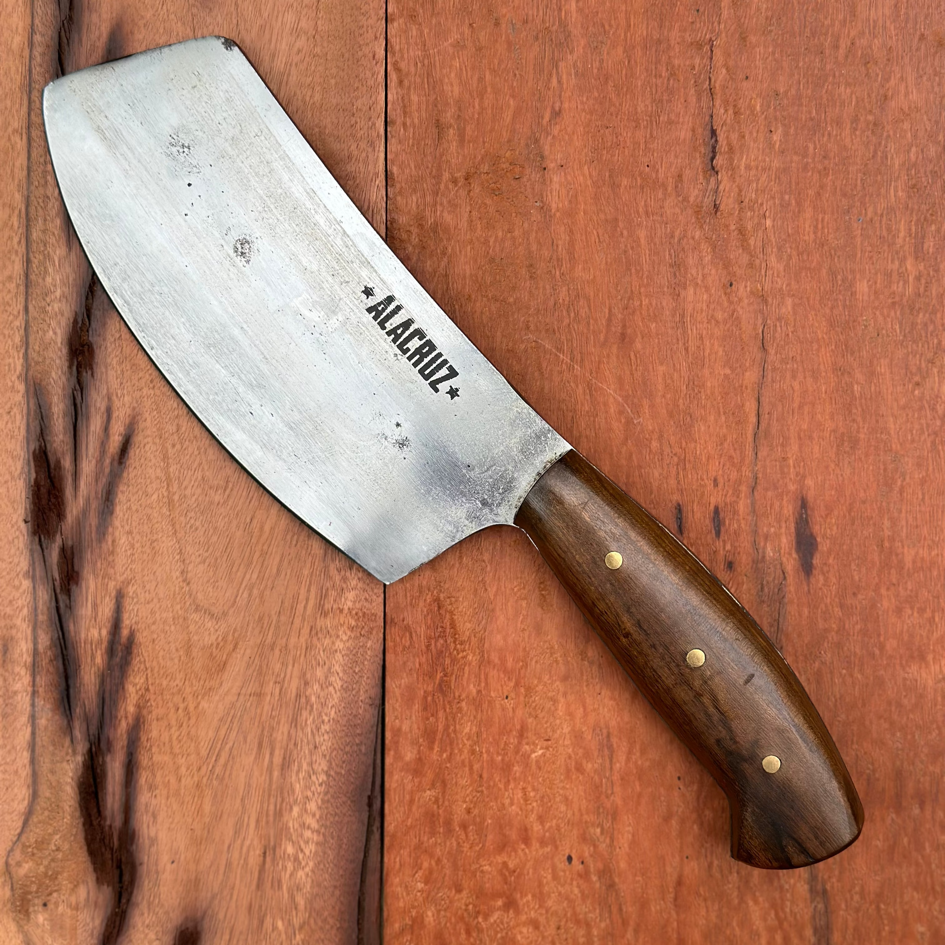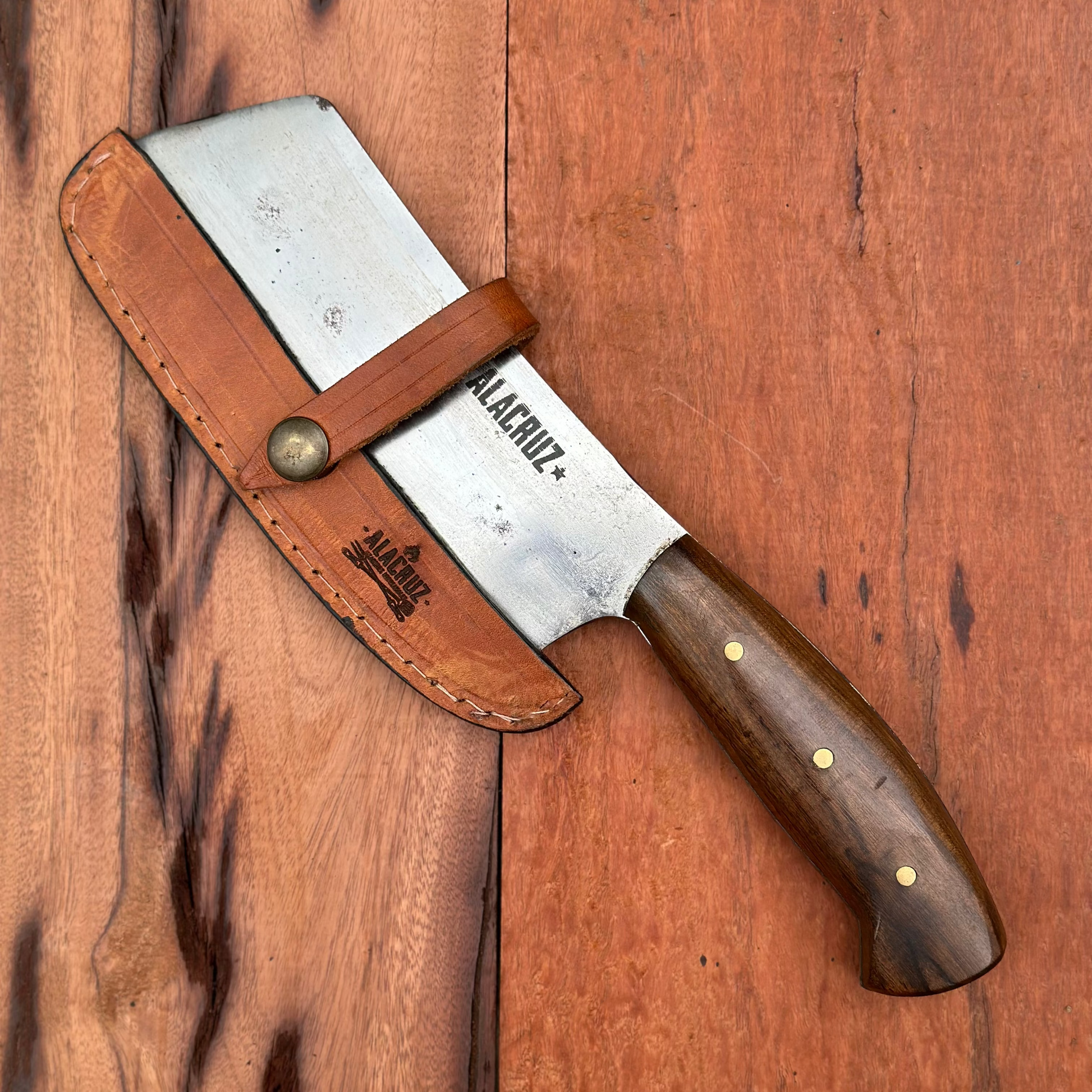 Nuestra hachuela ALACRUZ está fabricada en acero al carbono de alta resistencia, ideal para cortes contundentes y precisos en cualquier tipo de carne. Su mango ergonómico y firme de madera dura y longeva asegura un agarre cómodo y seguro, incluso en los cortes más complejos del asado.