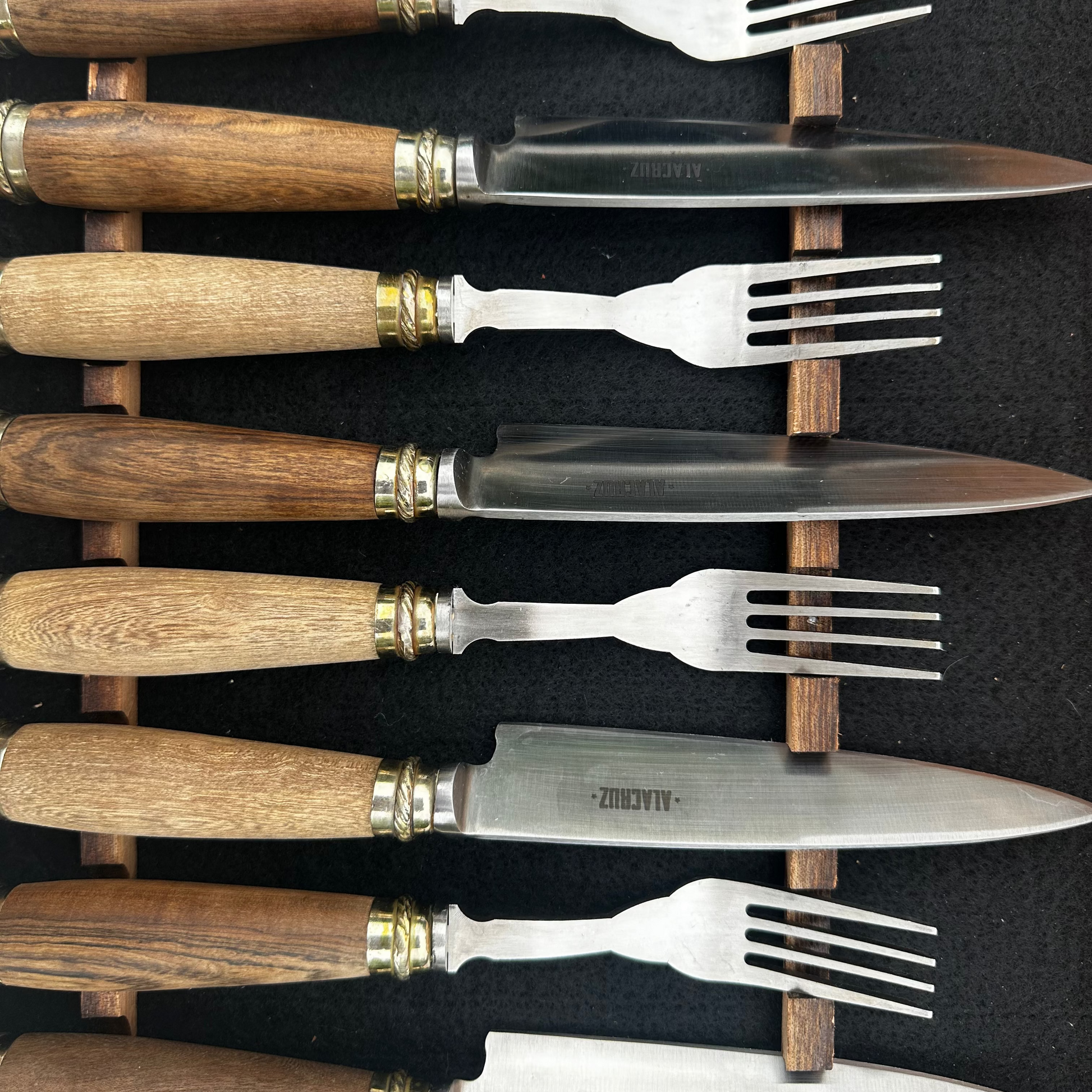 Con la Caja de Cubiertos para 12 personas ALACRUZ, el ritual del fuego se completa en la mesa. Este set de 24 piezas está compuesto por cuchillos y tenedores de acero inoxidable, con mango ergonómico de madera y apliques en alpaca que combina funcionalidad, diseño y una estética rústica incomparable.